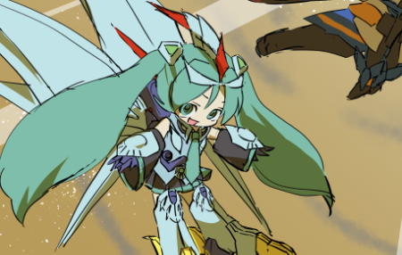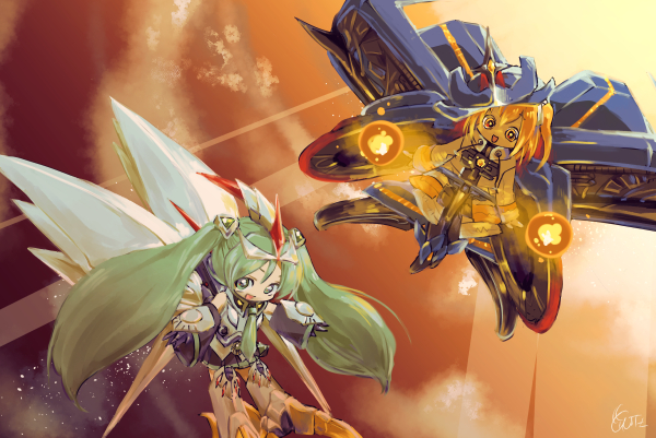 ・足立レイ×グランゾン、初音ミク×サイバスターのイラスト(ネットプリント)